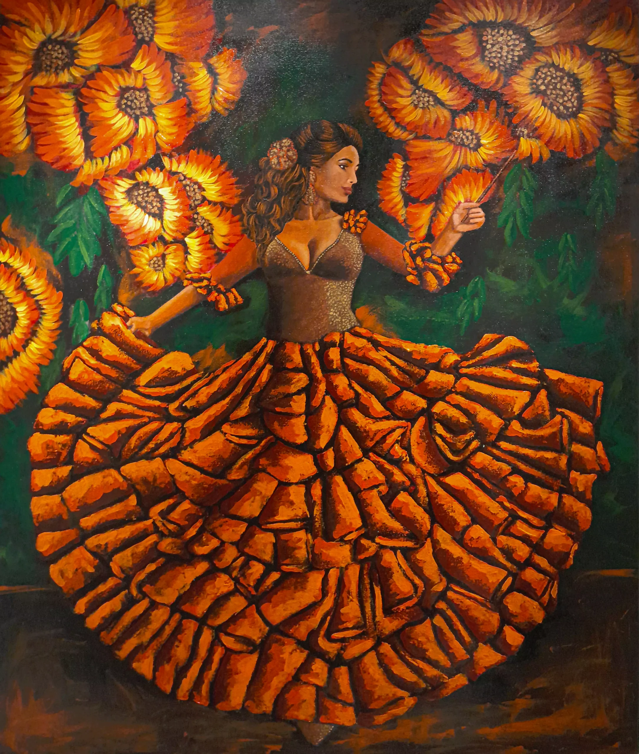 Obra de arte perteneciente a la Serie Bailarinas de Flamenco, una colección que captura la pasión y el movimiento del baile flamenco. Esta pieza presenta una bailarina en pleno giro, vistiendo un espectacular traje de volantes en tonos naranjas, que se despliegan en un círculo perfecto, creando un efecto visual hipnotizante. El fondo muestra girasoles gigantes en tonos dorados y naranjas sobre vegetación verde, que se integran armoniosamente con los colores del vestido de la bailarina, creando una composición donde la figura humana y la naturaleza se fusionan en una celebración de color, movimiento y energía flamenca.