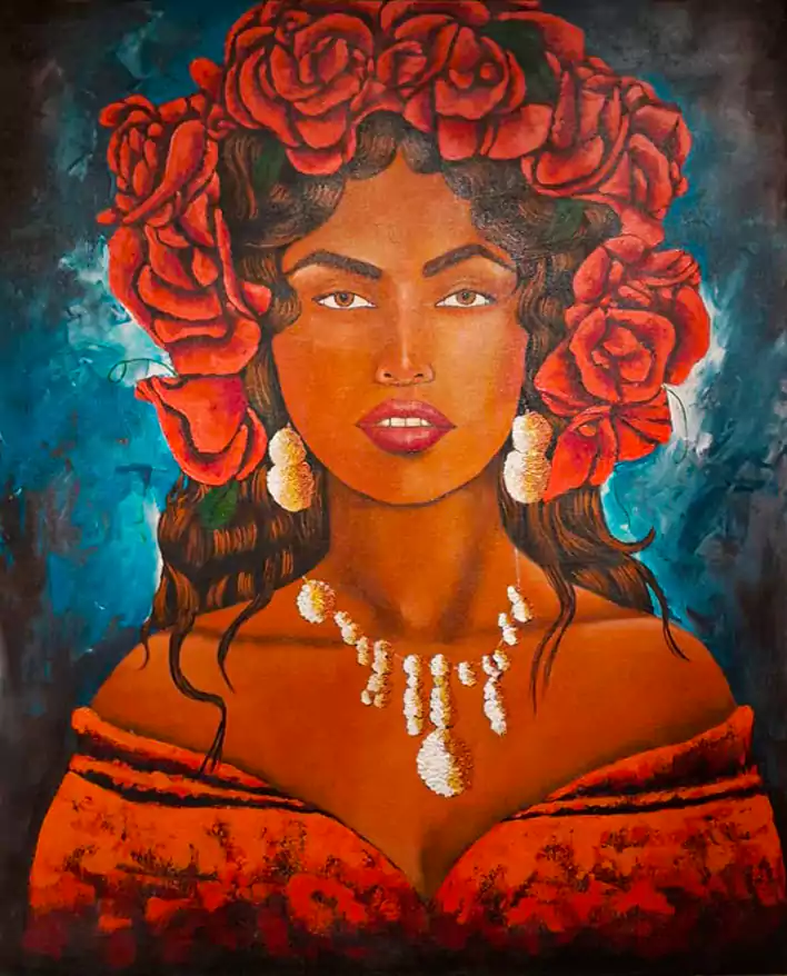 Obra de arte perteneciente a la Serie Emperatrices, una colección que celebra la majestuosidad, el poder y la dignidad de la figura femenina. Esta pieza presenta a una emperatriz coronada con rosas rojas vibrantes que simbolizan pasión, fuerza y belleza eterna, mientras que el fondo de azules profundos y turquesas crea un contraste dramático que resalta su presencia imponente. Los detalles en joyería, las perlas que adornan su cuello y los tonos cálidos de su piel y vestimenta refuerzan su estatus de realeza, transmitiendo elegancia, dignidad y la esencia atemporal de aquellas mujeres que gobiernan con gracia y sabiduría.