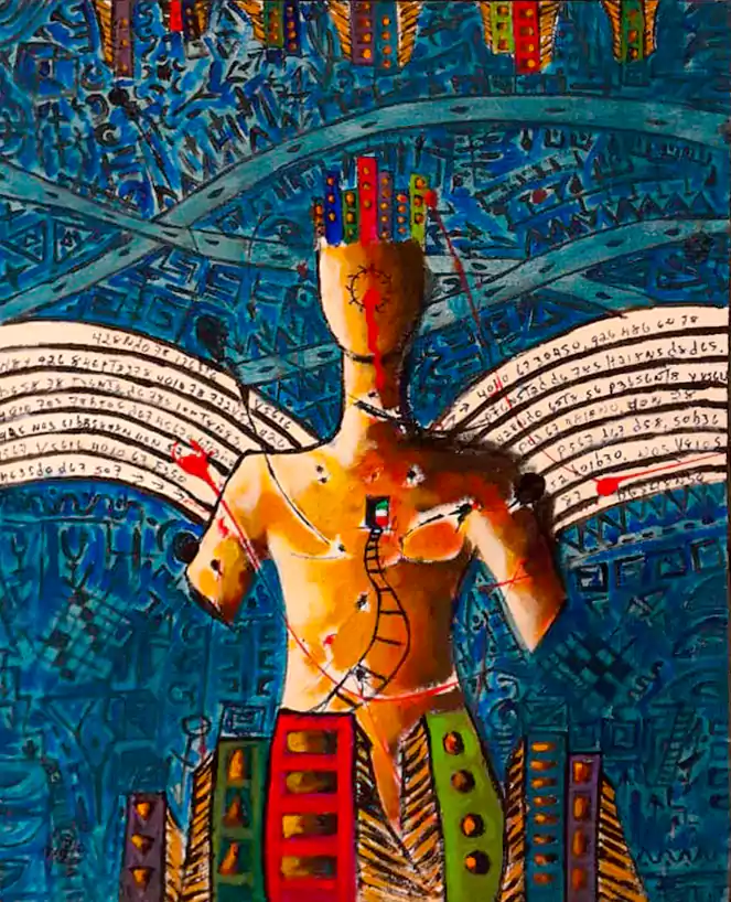 Obra de arte perteneciente a la serie Guardianes Urbanos, una colección que rinde homenaje a aquellas personas que nos protegen y guían en nuestro caminar diario. Estas figuras representan a los seres que iluminan nuestro camino y nos brindan apoyo incondicional, aun cuando ellos mismos atraviesan momentos de angustia, sufrimiento o están heridos, reflejando la crudeza de la vida real.
