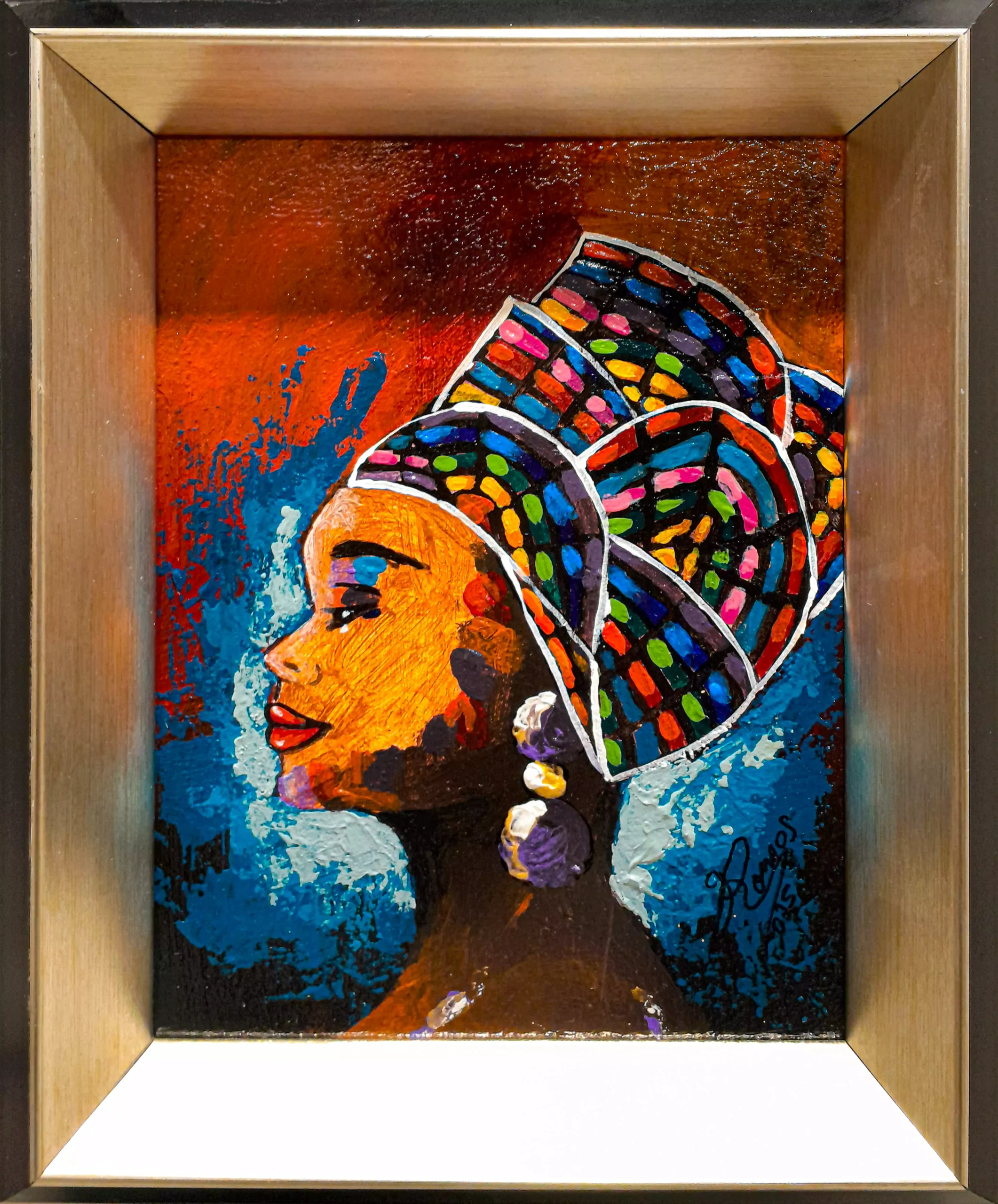 Obra de arte perteneciente a la serie Mini Princesas, realizada con una paleta de colores vibrantes y expresivos que resaltan la belleza y fuerza de la figura femenina. La pieza transmite elegancia y carácter, y se presenta con un bello enmarcado, tal como se aprecia en la imagen, que realza su valor artístico y la convierte en un elemento ideal para cualquier espacio.