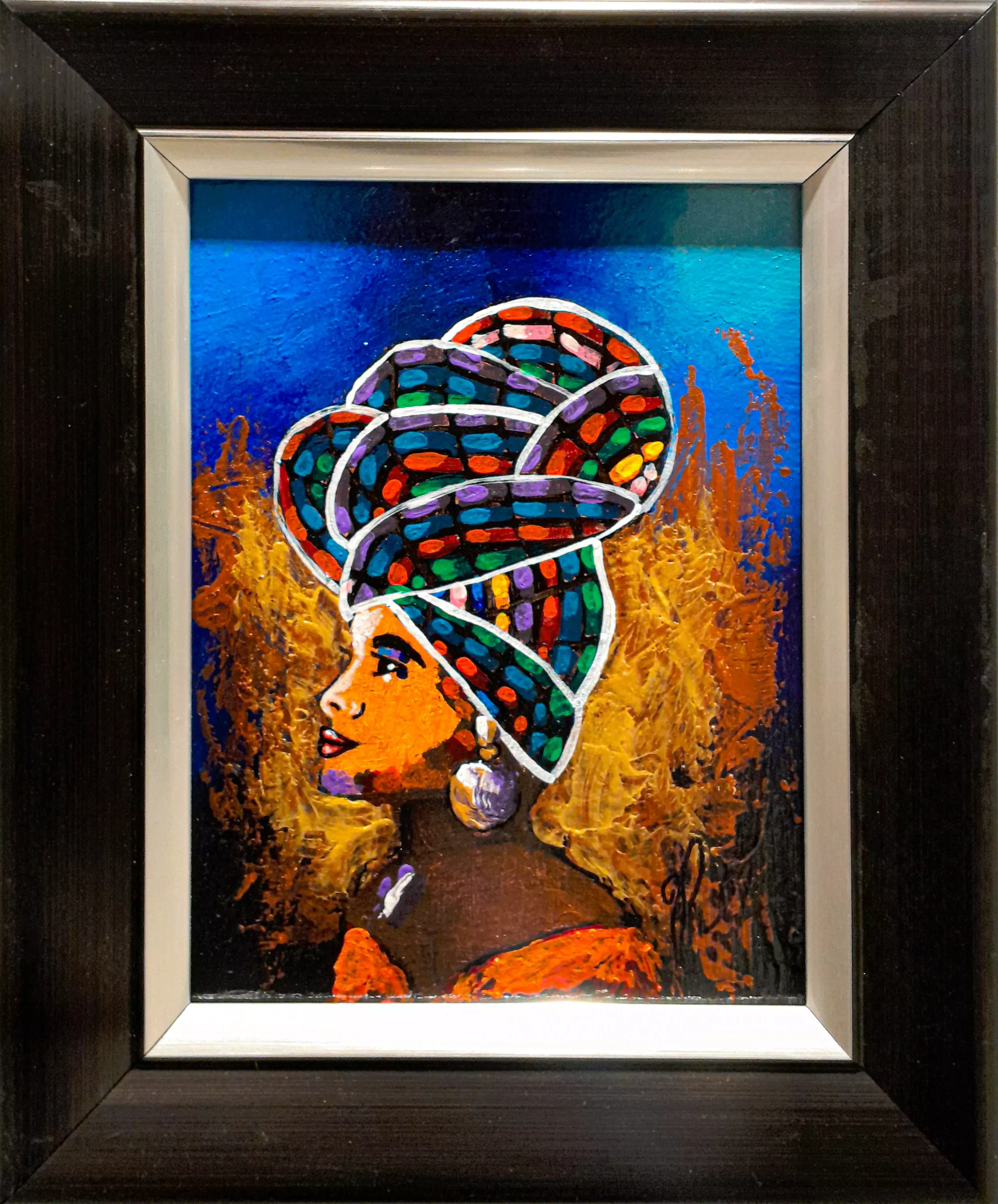 Obra de arte perteneciente a la serie Mini Princesas, realizada con una paleta de colores vibrantes y expresivos que resaltan la belleza y fuerza de la figura femenina. La pieza transmite elegancia y carácter, y se presenta con un bello enmarcado, tal como se aprecia en la imagen, que realza su valor artístico y la convierte en un elemento ideal para cualquier espacio.