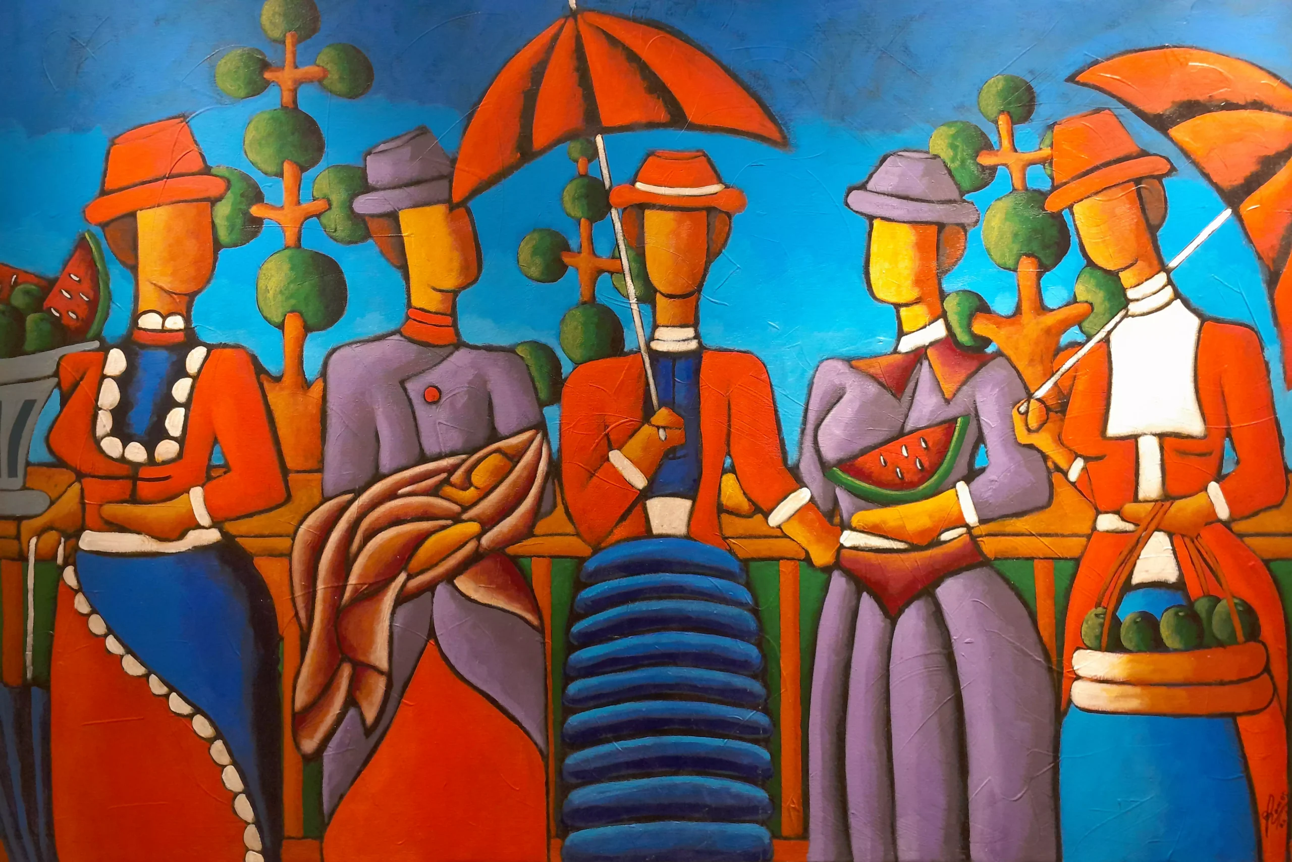 Obra de arte perteneciente a la Serie Parisinas, una colección donde el artista Ramos se inspira en la elegante vestimenta parisina de los siglos XVII y XVIII, reinterpretándola con su estilo característico. Esta pieza presenta figuras estilizadas, ataviadas con sombreros elaborados, sombrillas y vestimentas propias de la alta sociedad francesa de la época. Los colores vibrantes—naranjas, azules, rojos y morados—contrastan con el fondo de cielo azul y árboles estilizados.